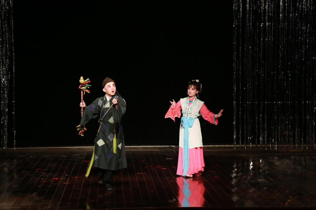 “云浪翻滚雾沉沉,天规森严冷冰冰。凡人都说神仙好,神仙岁月太凄清。”由洪薇、王庆芳等人演出的折子戏《鹊桥》唱腔淳朴清新、悠扬动人,开嗓即将观众带入到了“天仙配”的故事当中。《拾玉镯》是京剧《法门寺》的一折,讲述孙玉娇三拾玉镯终成良缘的故事,演员胡圆通过眼神和肢体的完美配合,充分表现了小姑娘孙玉娇的丰富内心情感。“拾玉镯时,孙玉娇一会儿转转眼珠想计策,一会儿假装淡定却羞答答的笑,两只手搓着身体,着急、羞涩、好奇真的被演员极其到位地表现出来了。”音乐学专业2017级的万炎说,“我们观众都在底下着急,为什么还不捡起玉镯呀。”