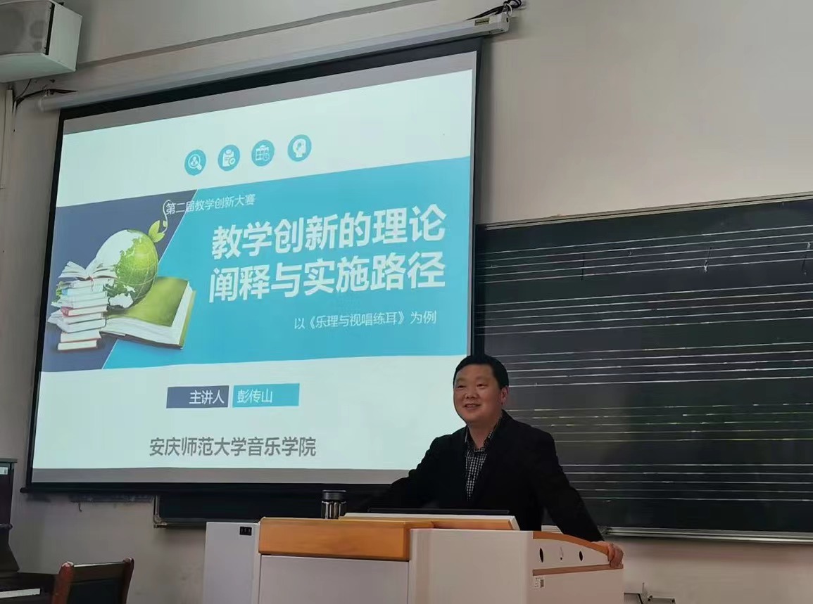 此次报告,彭传山老师分别从理论阐释、实施路径、标准解读及案例展示四个方面对教学创新进行细致讲解,在场的全体师生认真聆听并思考彭老师的精彩发言。从理论层面到具体案例,彭老师深入浅出地对“教学创新”这一主题进行分析与阐述;同时,探讨了音乐课堂渗入课程思政理念的方式与方法,在教学设计的理念、内容、教法、评价等各个环节,都创新性地涉及了课程思政的教学思想。报告在最后部分——案例展示板块推向高潮,彭老师带领大家观看了其本人录制的创新教学大赛视频与教学设计方案,该课堂教学中的教学目标、教学内容及教学方法等方面均体现了教学的创新性,突出了以学生为中心,以产出为导向,持续改进的教育理念。