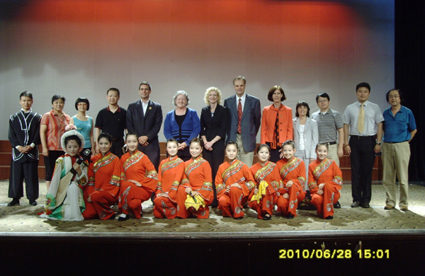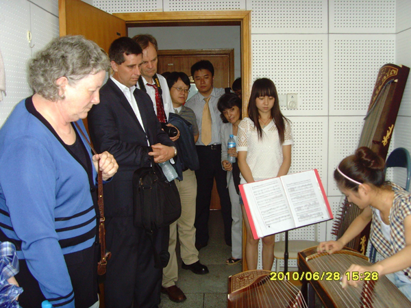 院长荀安华、副院长刘蕊的引导下,客人一行还参观了艺术楼教室、琴房,饶有兴趣地观摩了马强伟老师的竹笛教学公开课,参观了数码钢琴教室,欣赏了学生的古筝表演,灵活多样的课堂教学形式,学生富有激情的弹奏表演,给美国客人留下了深刻的印象。