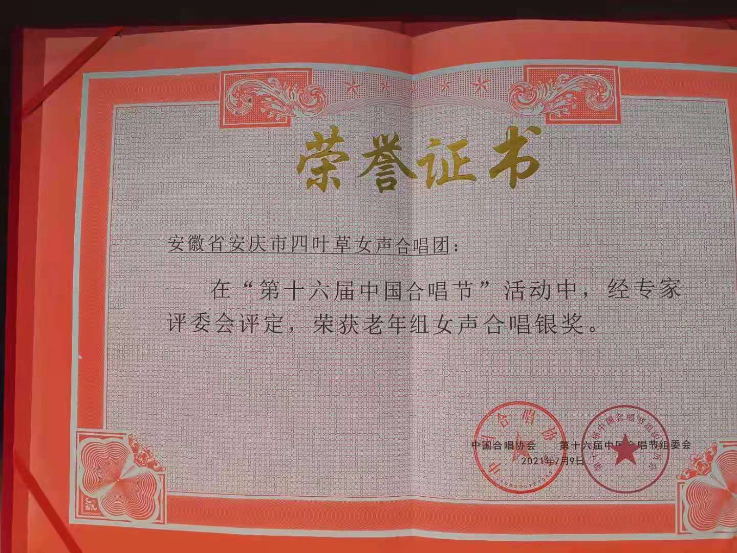 陈燕翔老师担任指导老师和合唱指挥的“安庆四叶草女声合唱团”在此次比赛中荣获老年组女声合唱银奖第一名。