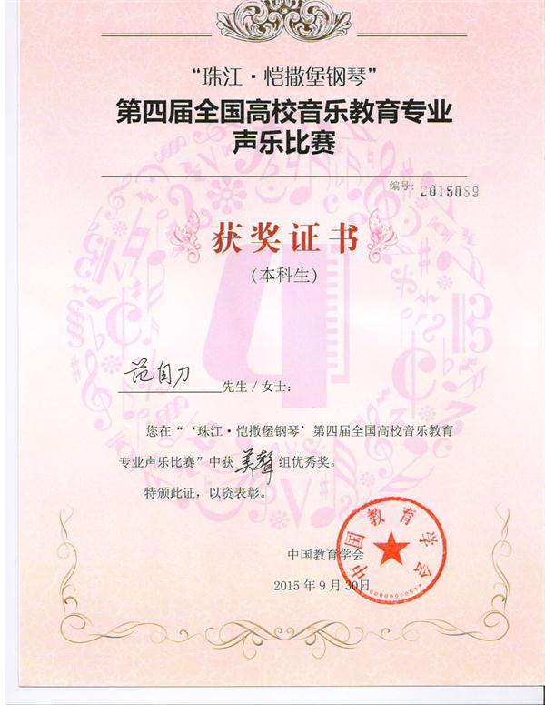 9月30日,我院音乐学专业学生范自力在第四届全国高校音乐教育专业声乐比赛中获得本科生美声组优秀奖,这是51论坛