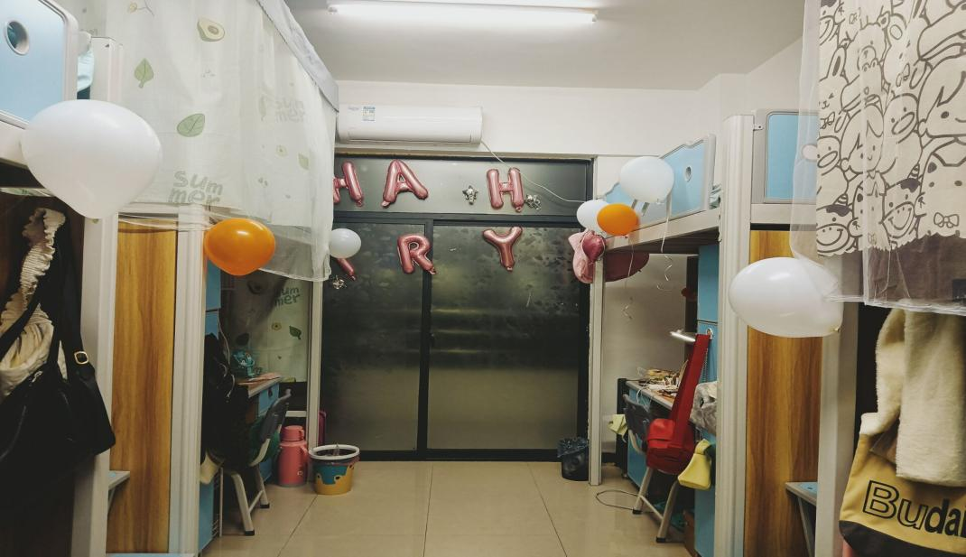 或用气球装饰,营造热闹的寝室氛围;或搭起各式床帘,展现宿舍特色;或张贴写有励志字样的书画,激励寝室成员努力学习。各寝室成员尽力发挥自身优势,打造宿舍特色。