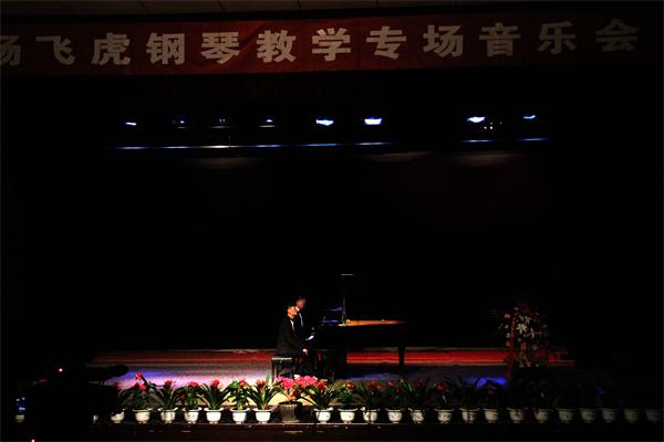 音乐会由《黄河船夫曲》序曲开始,由10级学生陈永霞演奏杨飞虎老师协奏,师生默契的配合把黄河钢琴协奏曲的前两个乐章呈现出来;11级戴心同学演奏了莫扎特奏鸣曲K.333和肖邦op.25.1“竖琴”练习曲,莫扎特中流露出“含着眼泪的微笑”,而肖邦中流露着一丝莫扎特般天使之歌;陈永霞演奏的2首肖邦《夜曲》一直给人宁静和优雅,使现场的观众们陶醉在优美的旋律和动听的和声之中。接下来在主持人杨顺的即兴演唱助兴后,由钟王君同学演奏了钢琴曲《浏阳河》,运用了变奏的手法,通过逐次加花的方式加厚旋律的线条,丰富的表现力使得现场达到第一次高潮。中场休息后,荣丽娟同学以饱满而又低沉的低音和弦组拉开贝多芬的《悲怆奏鸣曲》开始,全场瞬间安静,细细的聆听,观众仿佛能从他的悲怆中听到贝多芬再诉说他那坎坷不平的人生。车尔尼的八度练习曲时而像一首长号协奏曲,时而像一首轻快的波尔卡,进一步展现了演奏者技术。紧接着便是梁媛辰同学演奏的贝多芬的巨作《黎明奏鸣曲》,活泼的跳音,清晰的倚音,都在诉说这黎明前的欢乐,为我们探寻清晨森林里活泼欢乐的大聚会,鸟儿在歌唱,松鼠在跳舞,黎明的欢歌正在森林里唱响,台下的观众闭目在细细品味,如痴如醉。随后由陈永霞再次登台演奏了颇具难度的拉赫马尼诺夫前奏曲和肖邦谐谑曲,充分展现了浪漫派的激情与创新,拓展了琴的全新演奏技术,并将传统和声发展到极致。最后,杨飞虎老师弹了一首充满了梦幻色的李斯特夜曲《爱之梦》,杨飞虎老师技巧娴熟,感情细腻与琴声很好的交融在一起,音乐深情婉转、给人安静,使听者如痴如醉,陶醉在琴声里,台下观众听得如痴如醉,在观众经久不息的掌声中,音乐会圆满的落下了帷幕。整场音乐会结构构思巧妙,用纯钢琴演绎了多首不同风格题材的中外经典作品,精选的片头一首意大利情歌和片尾土耳其进行曲也给听众留下了深刻的印象。