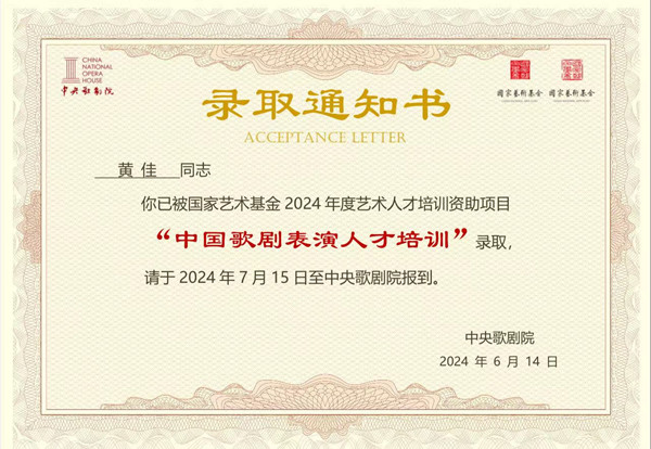 声乐专业博士黄佳,于2024年7月,参加了国家艺术基金重点资助项目“中国歌剧表演人才培训”。