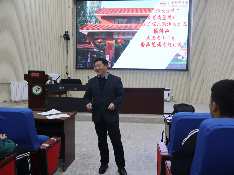 副院长彭传山,为皮山二中音乐艺术班学生作题为《音乐艺考乐理听写视唱的内容与方法》的专题讲座。高一、高二全体音乐艺考生及音乐教研组教师共六十余人参加学习。讲座由皮山县初中音乐教研员、县音乐名师工作室成员、皮山二中音乐美术教研组长陶丽娟老师主持。