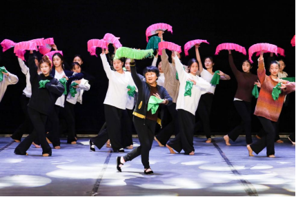 期间,宁小双教授向在座学生演示了花鼓灯表演中一些基本动作,如踏步、虎口夹扇、两指捏扇等。见台下学生跃跃欲试,宁小双教授便现场进行花鼓灯组合教学,来自舞蹈表演专业2022、2021级共30名学生上台参与。在宁小双教授的指导下,学生们身体灵活,步伐轻盈有力,流畅地跟完了伴奏。“看到大家学的那么认真,我感到很欣慰,花鼓灯是我国的传统民间舞蹈,在专业课程学习中,学生们在了解其他文化舞种的同时,也更应该学习了解并发展我们自己的传统文化。”宁小双教授说道。通过让学生上台进行展示动作、亲身体验,以加强对花鼓灯体态的认识,增加了趣味性、生动性和实践性。同学们都非常珍惜这次宝贵的学习机会,认真聆听学习课程,并积极互动。
