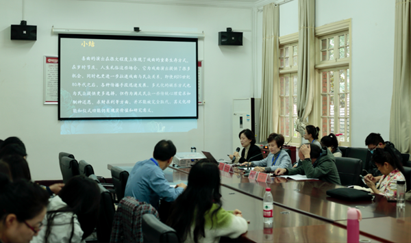 的孟凡玉教授对以上三位学者的发言进行了深入评议。唐彦春副教授聚焦于皖西南地方剧种喜曲类剧目,为我们揭示了这一地域性剧种的独特魅力与文化内涵,对于地方戏曲研究具有重要价值。韩凌老师的论题探讨了徽州目连戏与佛教中国化的关系,这一研究不仅深化了我们对目连戏的理解,也为佛教文化在中国传播的研究提供了新的视角。刘红洲副教授则对亳州二夹弦戏曲的调式特征及旋律走向进行了深入分析,展现了其独特的艺术风格。三位学者的研究各具特色,为我们打开了安徽戏曲研究的新窗口。然而,地方戏曲的研究往往面临资料匮乏等难题,希望学者们在未来的研究中能够克服困难,深入挖掘,为安徽戏曲的传承与发展贡献更多智慧与力量。(撰稿:王欣 摄影:学生记者 徐慧东 审核:高艳)