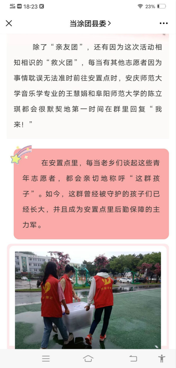 家住马鞍山市当涂县的王慧娟是音乐学专业2018级(1)班的学生,当涂县防汛形势严峻,截至23日,当涂县团结街小学安置点已安置转移群众350余人。当涂团县委组织了20多名青年志愿者赴团小安置点,帮助和抚慰转移群众。王慧娟主动报名,和他的父亲一同成为抗洪志愿者。打扫卫生、整理物品,她和乡亲们拉拉家常,送上热水热饭...什么活都干。王慧娟说:“作为一名志愿者,面对灾情能够贡献自己微不足道的力量,我感到非常自豪,也学到了很多在学校学不到的东西。”
