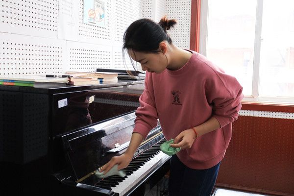 用稍润湿的毛巾擦拭乐器灰尘,再用干布擦干水渍……舞蹈表演专业2020级的周昕沛反复擦拭着钢琴,确保每一处缝隙都“照顾”到位。“对于经常需要练琴的同学而言,琴房就像第二个‘家’,希望大家能在更好的状态中提升专业技能。”一位练琴的学生在看到志愿者们的付出劳动后,向他们表达了内心的感谢:“谢谢你们为我提供了舒适整洁的学习环境,感觉练琴都更加有动力了!”
