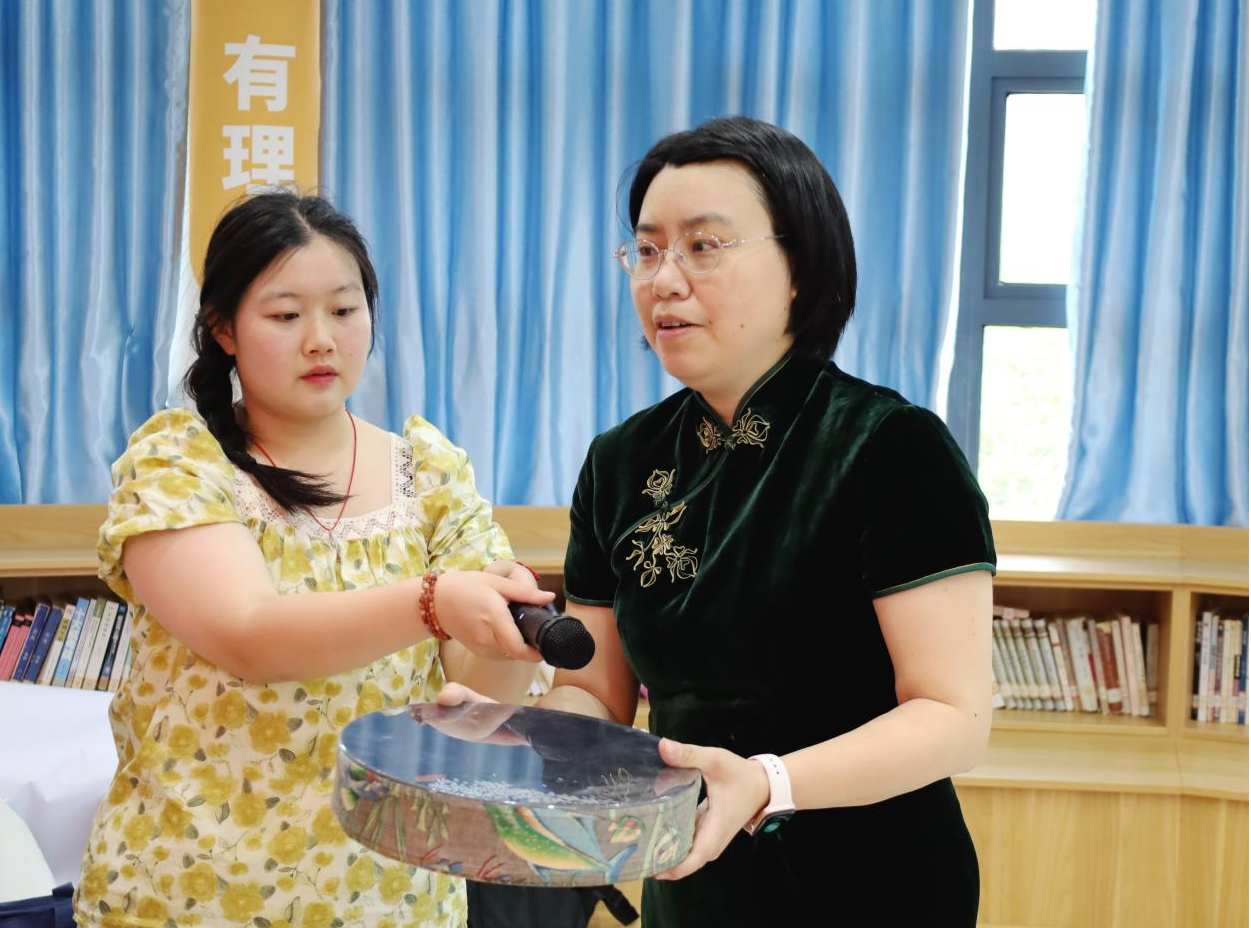 一根四五十厘米长的棍状乐器在学生间传递,大家纷纷伸手触摸,猜测其材质与原料。音乐学专业2024(3)班的陶艺反复摩挲表面纹路,轻轻叩击后说:“摸起来凹凸不平,有点粗糙,但不扎手,手感很特别。”经赵元揭秘,该乐器是用掏空的仙人掌枝干制成的雨声筒。“本以为仙人掌制成的乐器会很扎手,没想到触感意外温和。触摸着筒身纹路,听着雨声筒发出淅淅‘雨声’,感觉像有双温柔的手,抚平了我紧绷的神经。”