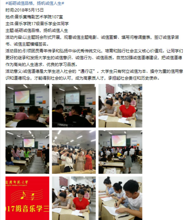 委员会音乐学专业2017级3班团支部成立于2017年9月,现有成员38人,其中,党员15人(含预备党员6人),占比39.4%,入党积极分子累计占比84.2%。四年来,支部在上级的坚强领导以及成员的共同努力下,力争创建优秀团支部,当好党的助手和后备军,荣获安庆市“五四红旗团支部”、校“红旗团支部”、“优秀团支部”、“十佳班集体”、“先进班集体”等荣誉。