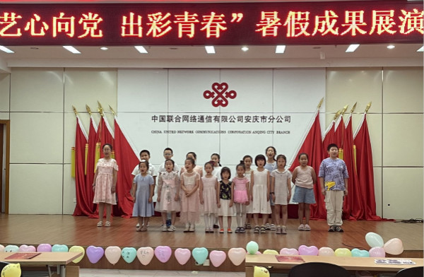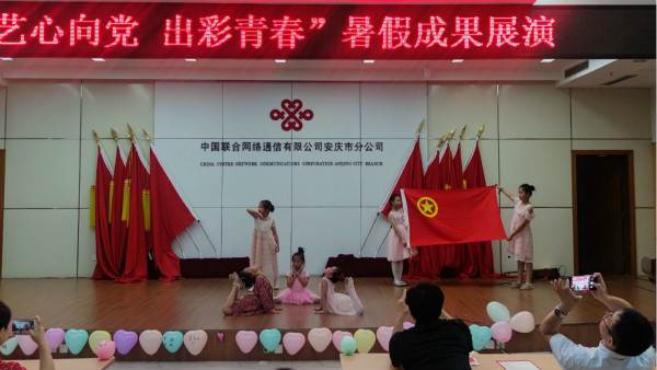 “三下乡”团队“音为爱”教育关爱实践团举办“艺心向党,出彩青春”暑期成果展演,9位小老师带领着17名小朋友于安庆市经开区联通公司为现场40余名观众献上了10个丰富多彩、各具特色的节目。