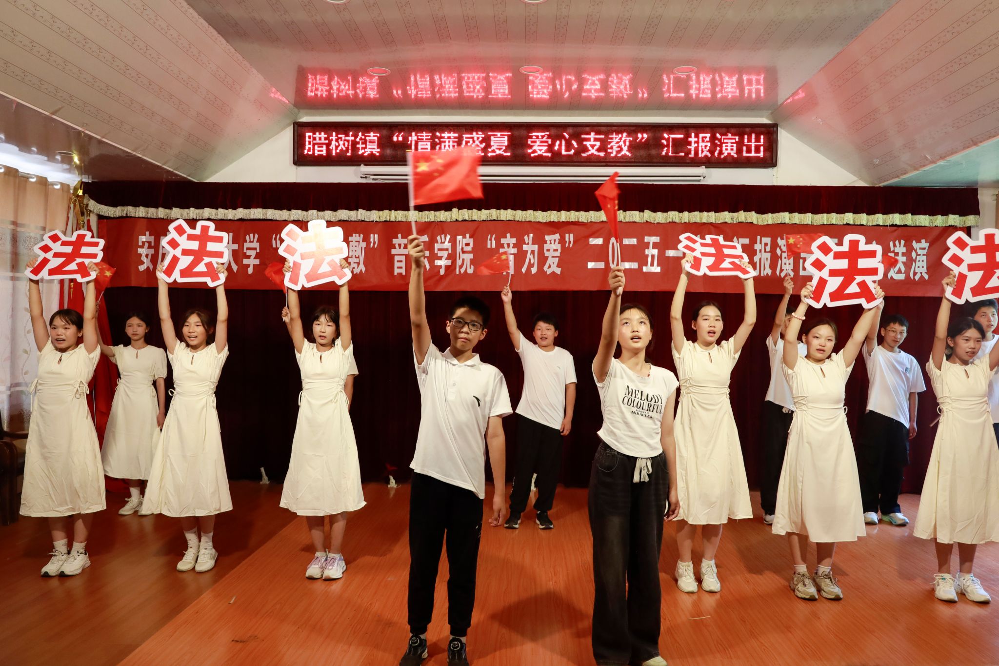 二是深耕艺术教育,培育审美素养。安徽省怀宁县腊树镇长期缺乏专业艺术教育。团队积极响应教育部普及艺术教育的号召,前往腊树镇开展艺术教育实践活动,深入基层,开展专业艺术教育和美育实践活动,要让孩子们有4样艺术收获:学1样乐器,唱1首歌,练1口普通话,沐1次心灵滋养。以器乐、声乐、舞蹈为主要艺术类型,以红色、法治、优秀传统文化作品、语言艺术作品为主体内容,集中开展12天的专业教学,并开展敬老院、乡村爱心送演。