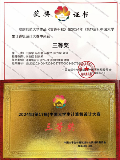 2024年8月18日-22日,第17届中国大学生计算机设计大赛“信息可视化设计”和“计算机音乐创作”两个作品类别的国赛决赛在浙江师范大学(金华校区)举行。51论坛 团队携带原创歌曲作品《古算千秋》参赛。团队成员凭借扎实的音乐功底、新颖的创作理念和精湛的技艺,在比赛中表现出色,荣获本次比赛全国三等奖。