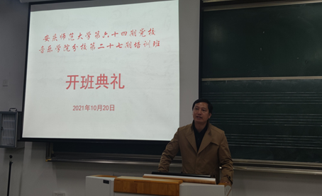 党校培训工作通知,并介绍了开班计划、课程安排、培训班班规等。音乐学2019级(4)班谢宝山代表本期培训班学员作了表态发言,表示将以热情端正的态度、刻苦的学习精神投入到党课学习中去,以行动与成绩来诠释服务奉献与积极向上。。
