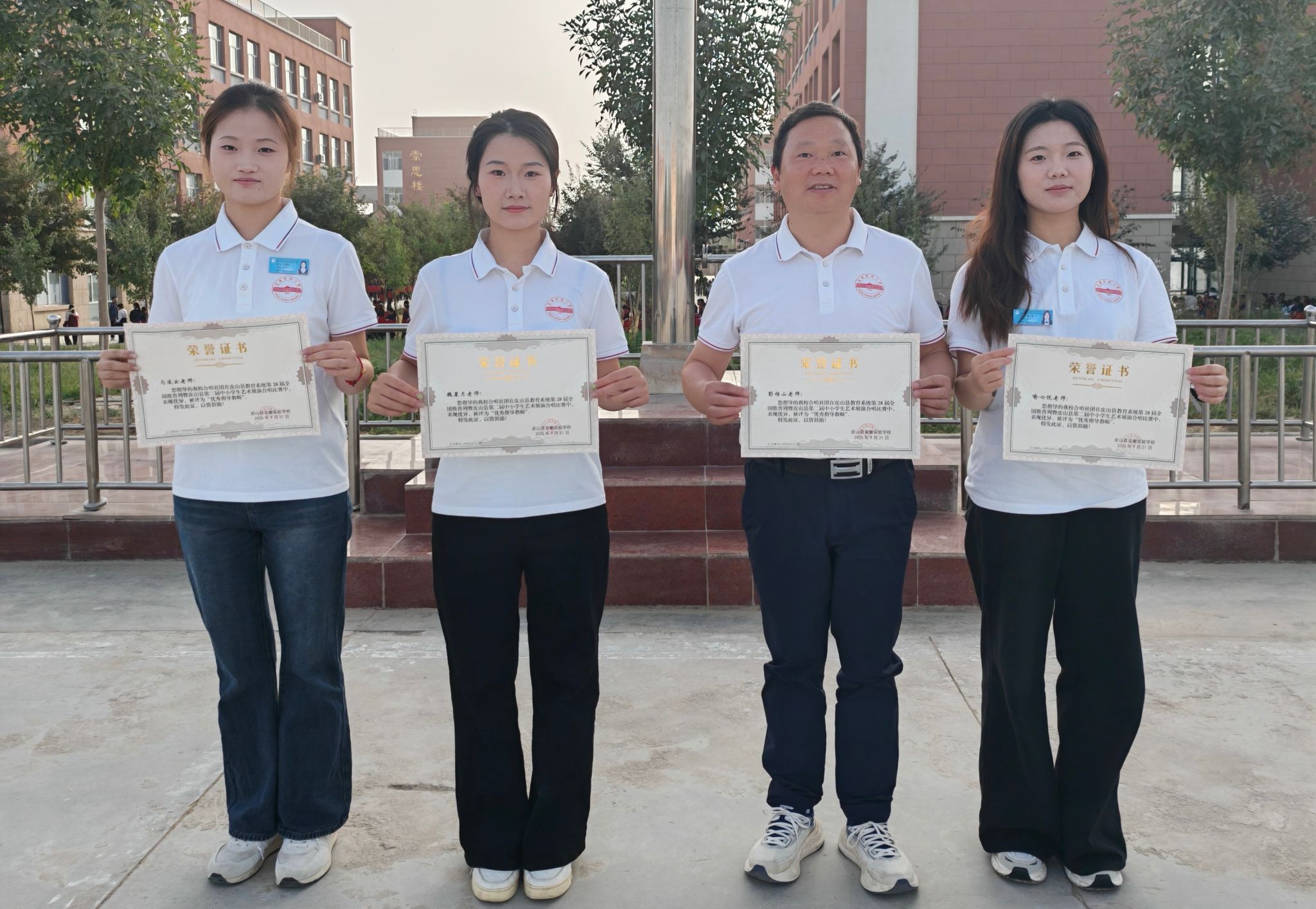 9月22日早晨,皮山县安徽实验学校第一校长孙金乙在升旗仪式之后向全校师生通报了合唱团在皮山县第二届中小学生艺术展演合唱比赛中的获奖情况,并向彭传山、魏星月、喻心悦、马凌云等人颁发了优秀指导教师证书,并勉励大家继续努力,再接再厉,争取在以后的活动中取得更大的成绩。