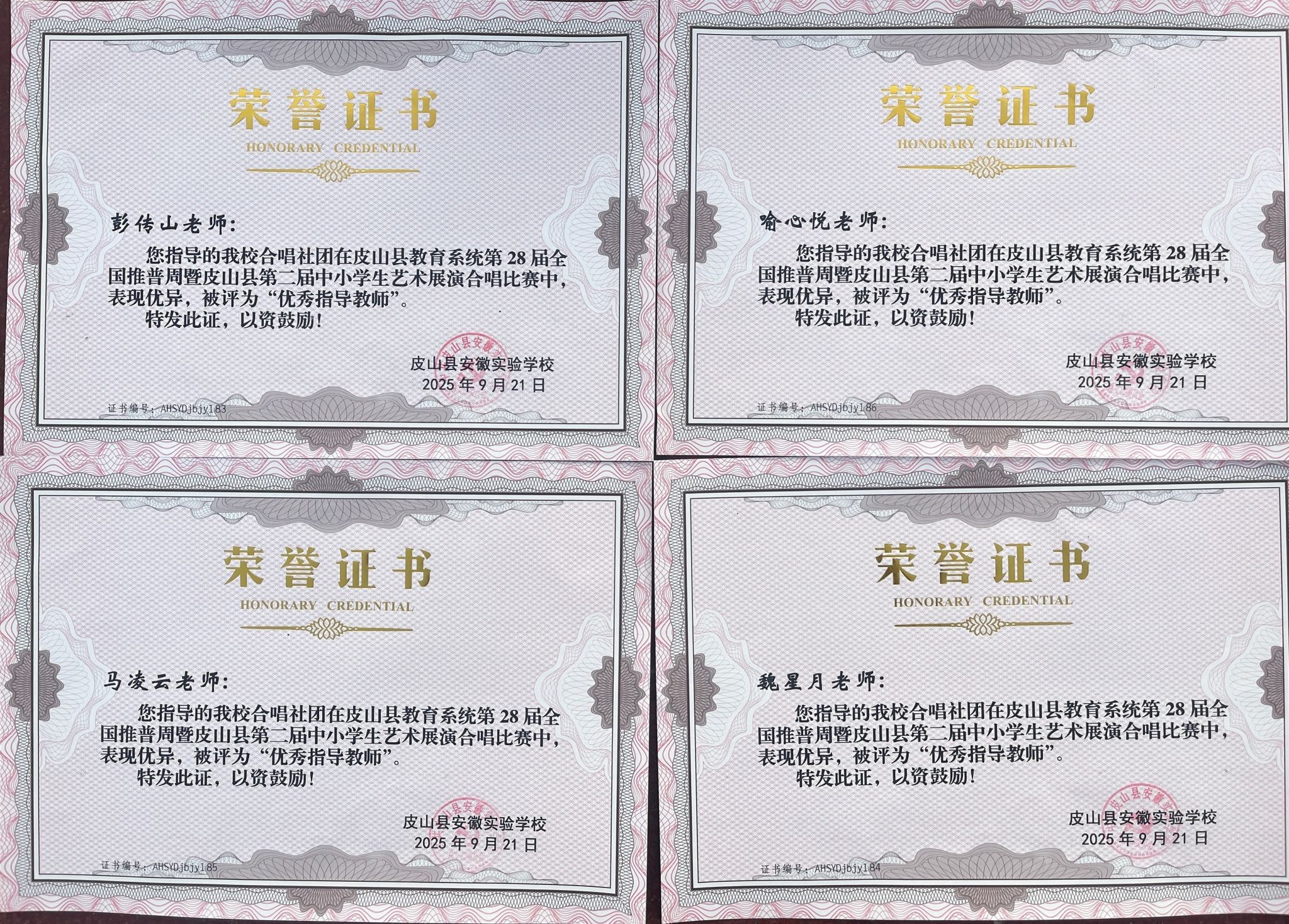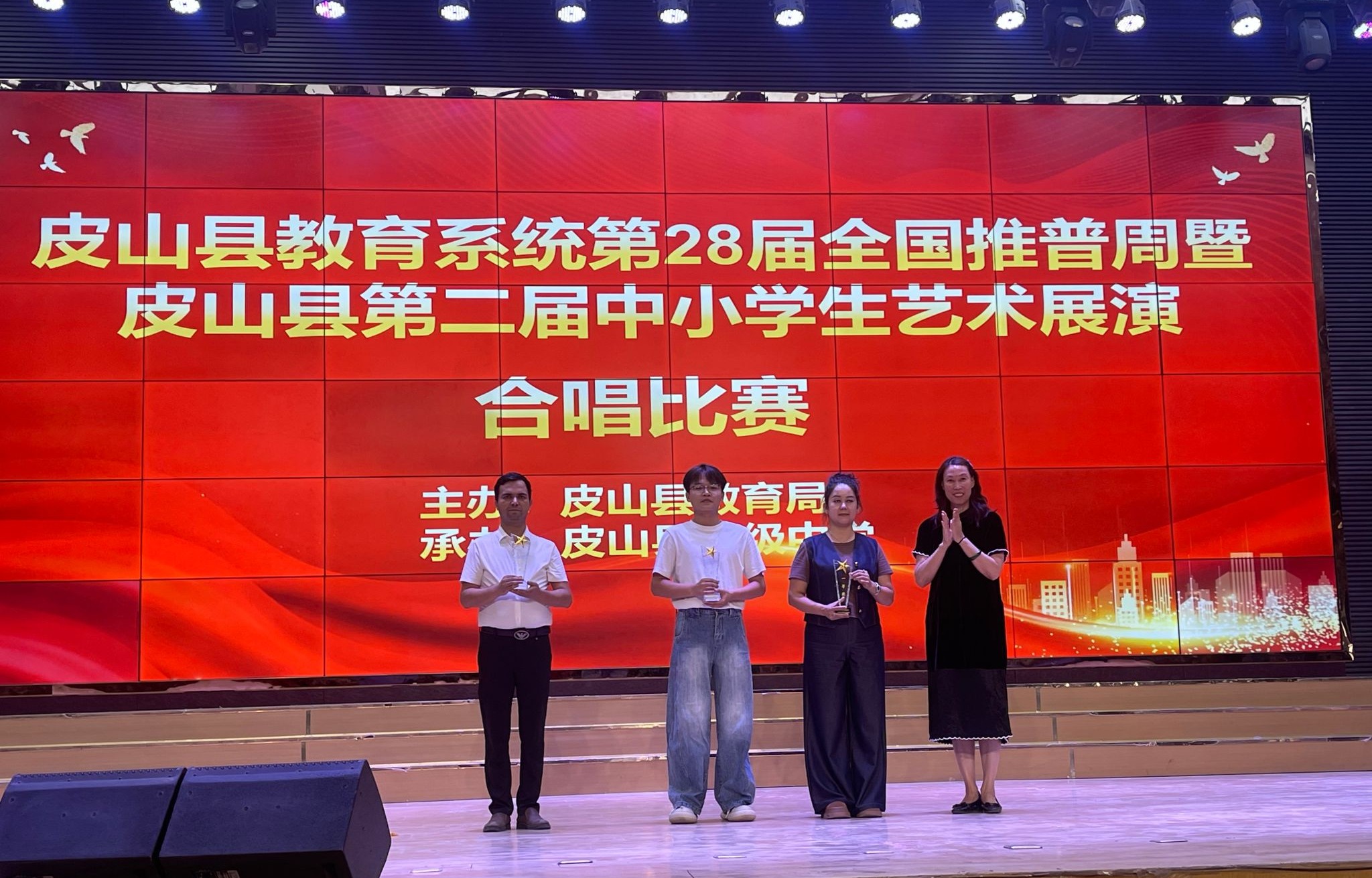 皮山县教育系统“第28届全国推普周暨皮山县第二届中小学生艺术展演合唱比赛”决赛于9月18日在皮山县高级中学体育馆举行。由魏星月、喻心悦、马凌云等同学排练,喻心悦指挥、彭传山伴奏的安徽实验学校合唱团演唱的《天耀中华》荣获初中组一等奖第一名。由李婧艳参与排练并指挥的第二中学合唱团演唱的《松花江上》与《保卫黄河》,荣获高中组二等奖。
