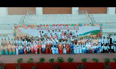 支教队员与身着各个民族传统服饰的学生携手登台,载歌载舞,点燃全场,展现了各民族师生团结友爱、亲如一家的动人场景。