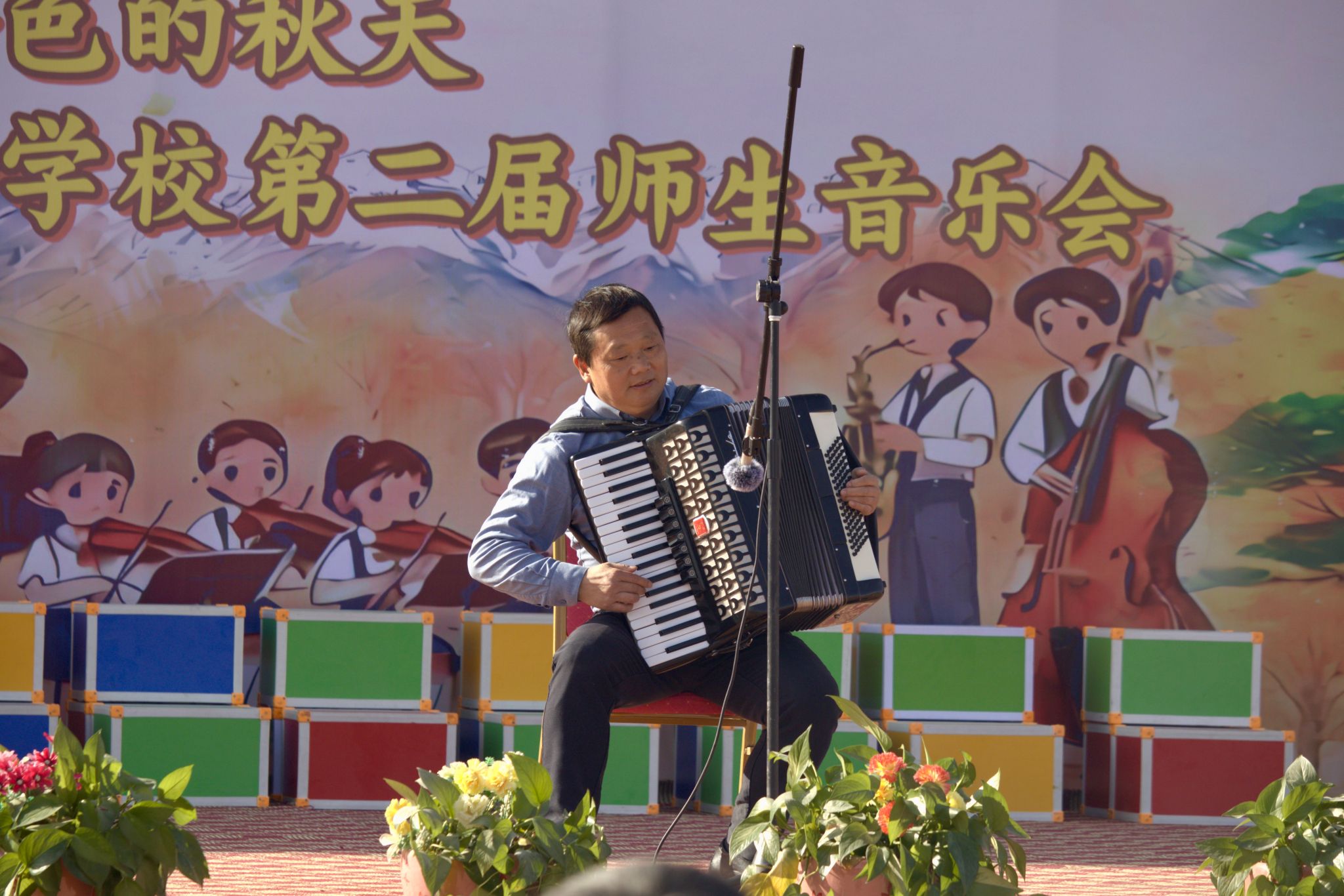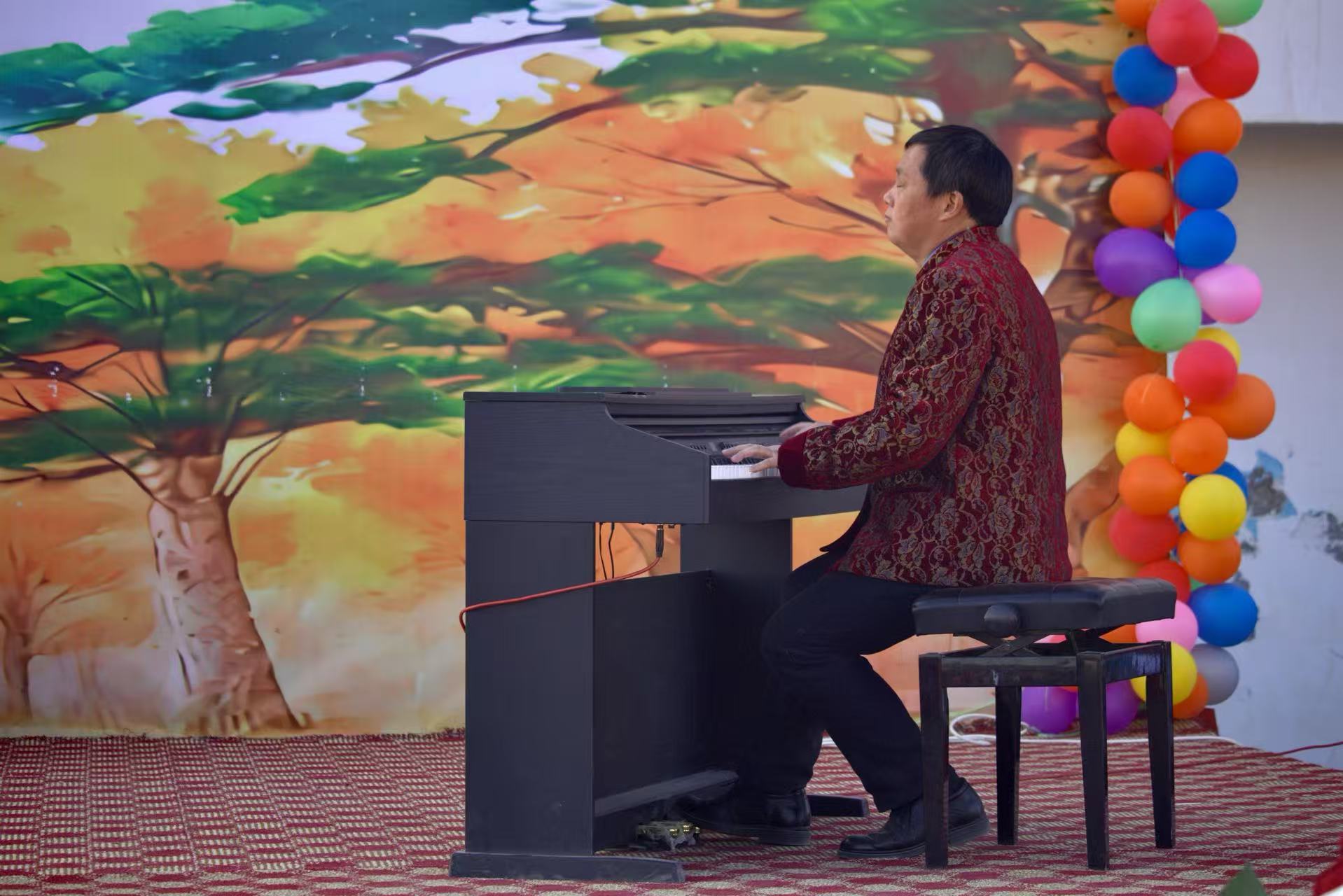 援疆支教指导教师、副院长彭传山先后演奏了手风琴和钢琴作品。手风琴曲《新疆民歌联奏》轻快活泼,熟悉的旋律响起,现场即报以热烈掌声;钢琴独奏《保卫黄河》则以磅礴气势奏响黄河壮歌,将现场爱国热情推向高潮。